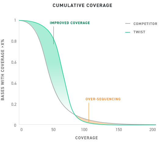 Our probes enable improved coverage of intended targets when compared to the competition. Improved uniformity increases the percentage of bases covered at the desired depth and reduces the amount of over sequencing.